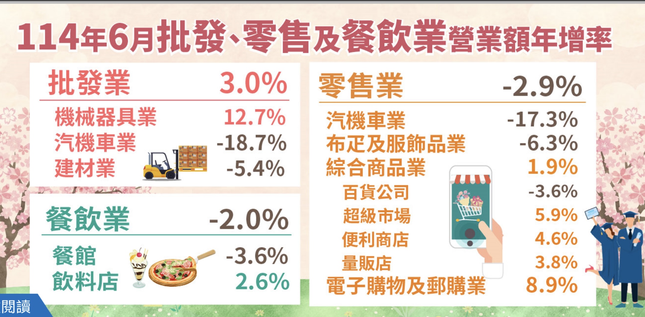3. 餐飲業:6月餐飲業營業額853億元,年減2.0%,其中餐館因端午節慶落點差異,假日天數少於上年同月,在比較基期偏高下,年減3.6%;飲料店、外燴及團膳承包業則受惠夏季新品與聯名促銷吸客,以及航空旅運市場穩定增長,航餐需求續呈活絡,分別年增2.6%及8.4%。綜計上半年營業額為5,314億元,年增3.0%。