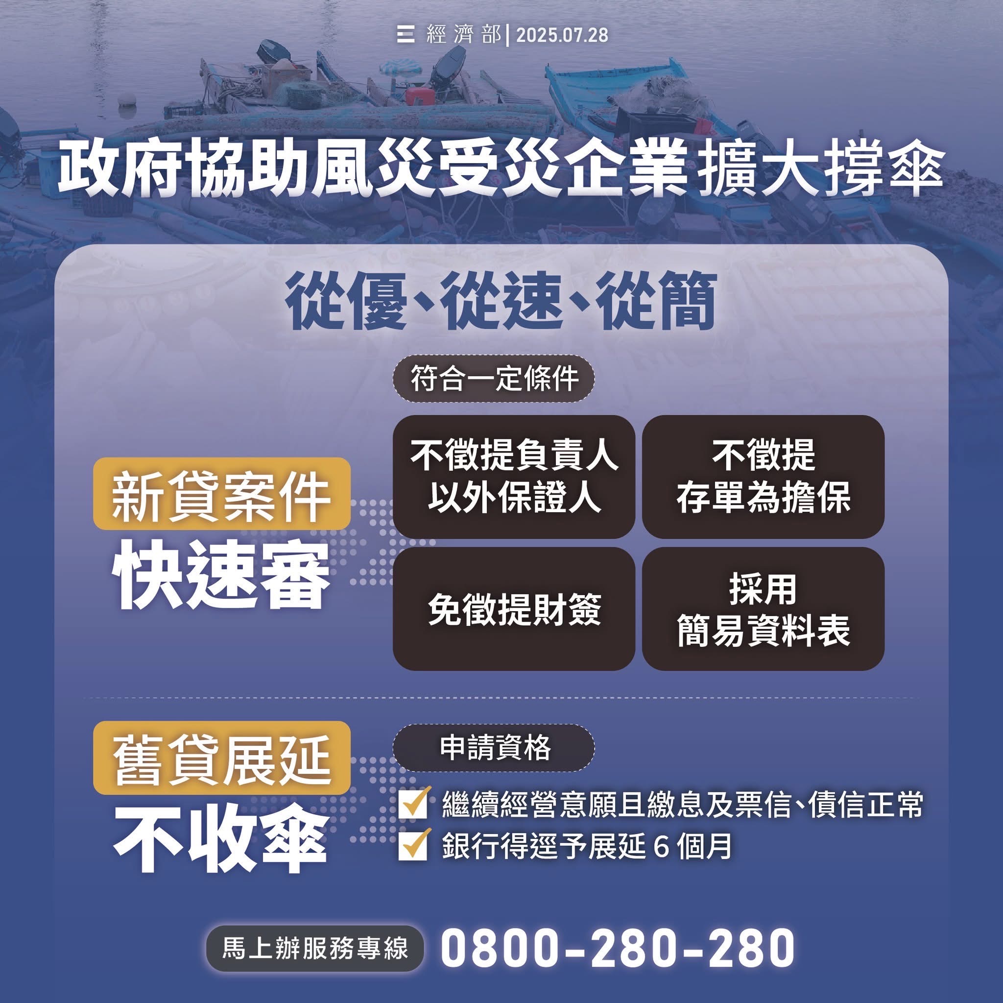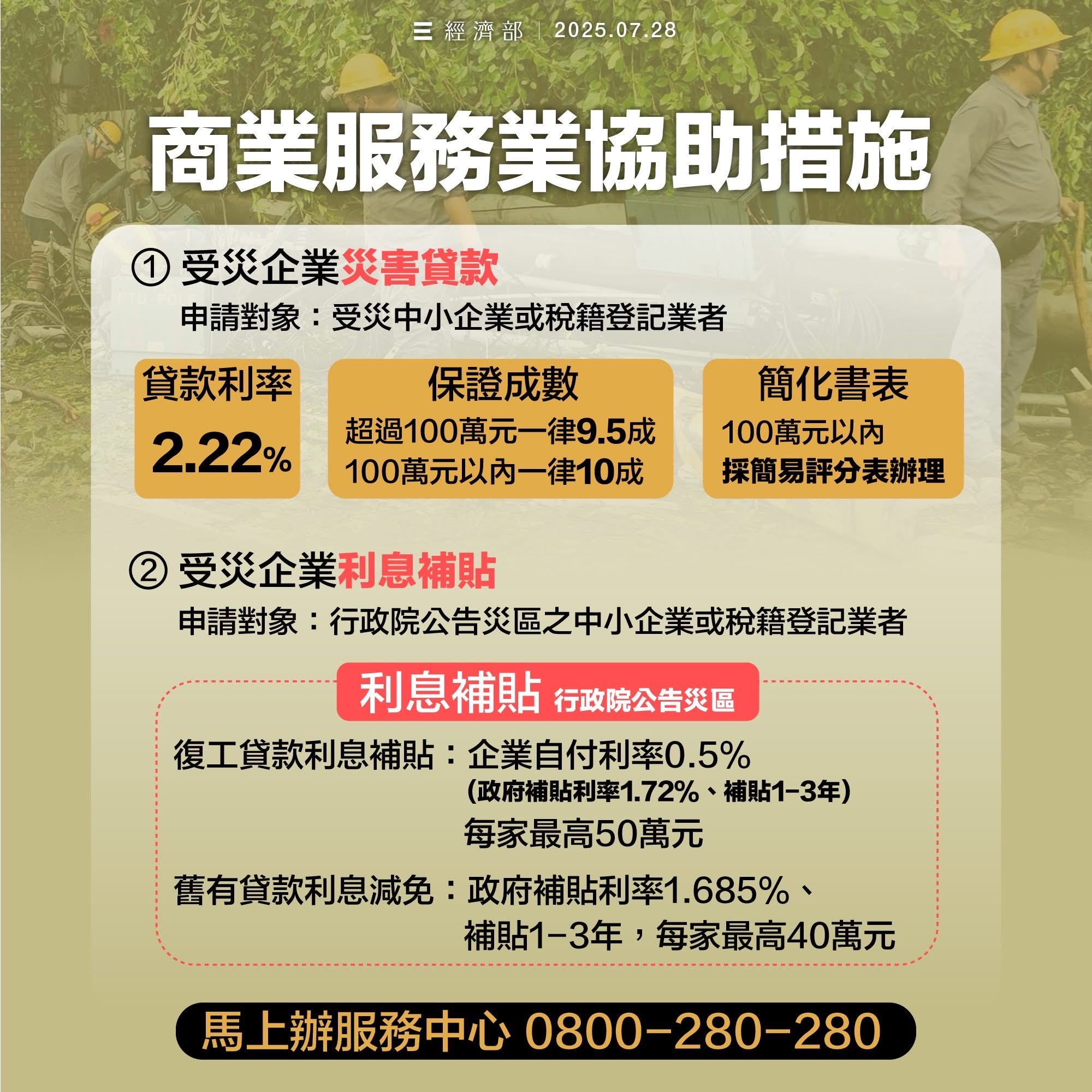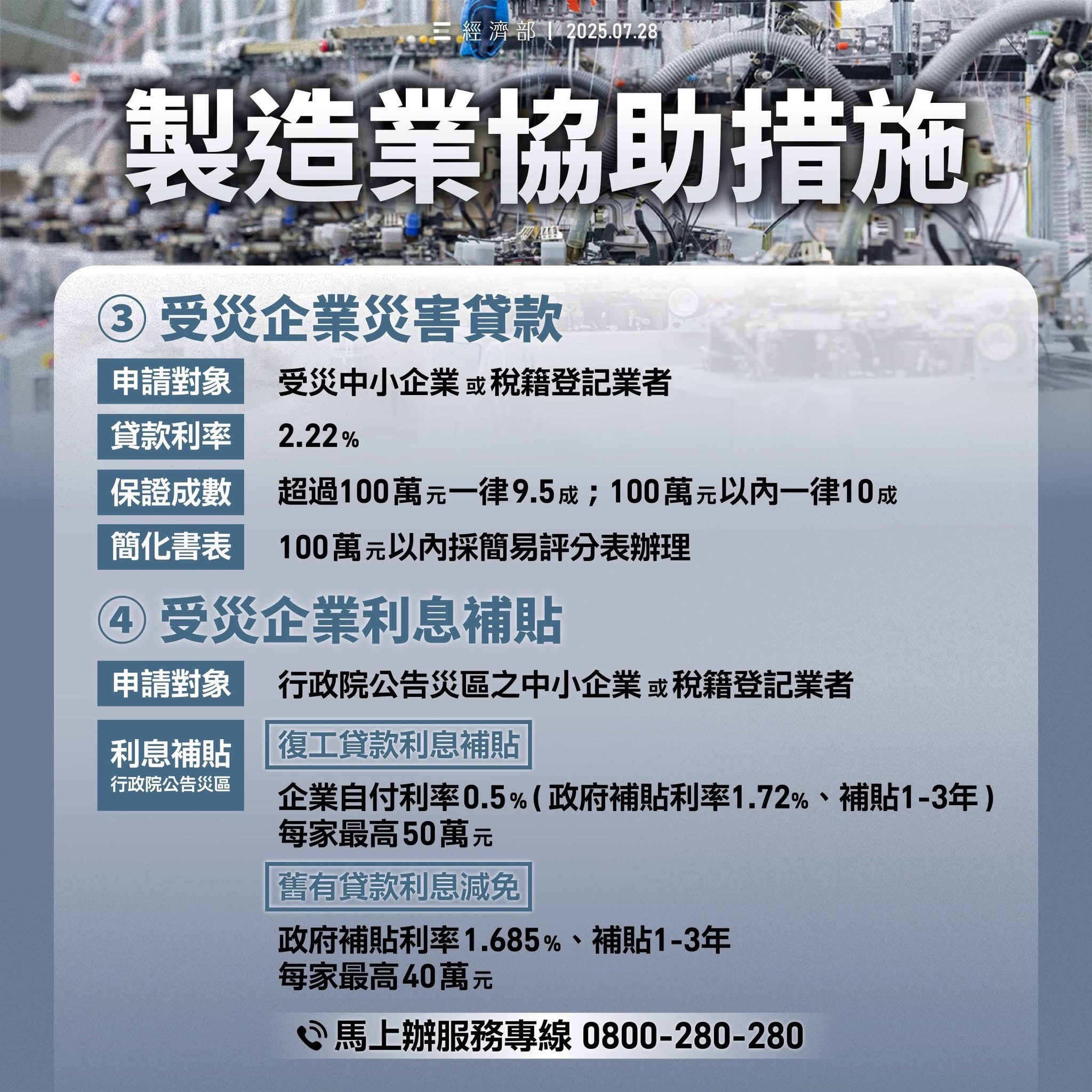 而無論製造業或商業服務業的受災企業,皆可申請利率2.2%的災害貸款,公告災區更可申請最高50萬元的復工貸款利息補貼、及最高40萬元的舊有貸款利息補貼。
