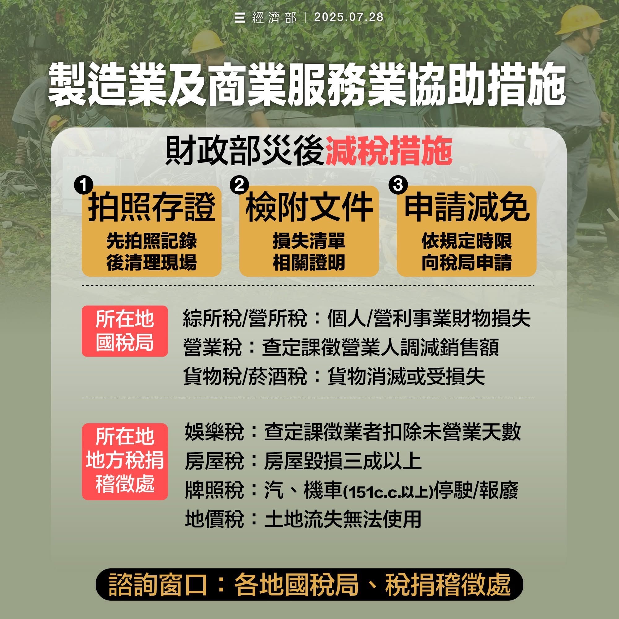 財政部也提供災後減稅措施,受災業者備妥文件,可向所在地國稅局申請綜所稅/營業稅、貨物稅、菸酒稅減免;並可向所在地之地方稅捐稽徵處申請娛樂稅、房屋稅、牌照稅、地價稅減免。