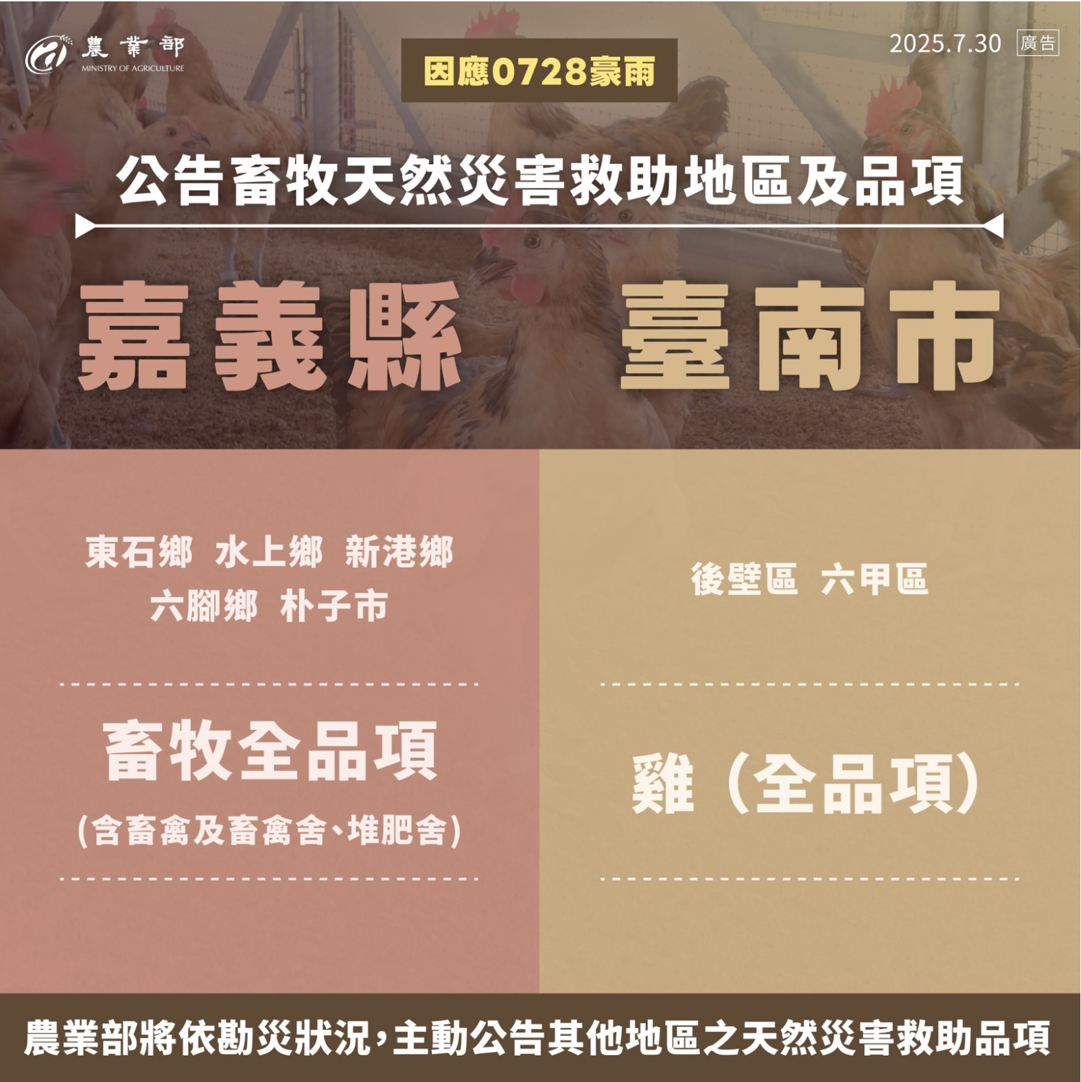 「0728豪雨」侵襲中南部地區,多處低窪地區發生嚴重積水,農業部今(30)日主動公告農業天然災害現金救助及低利貸款地區與品項,包括嘉義縣東石、水上、新港、六腳、朴子等5鄉鎮市的畜牧全品項(含畜禽及畜禽舍、堆肥舍),以及臺南市後壁、六甲2區的雞全品項。農業部已於28日函文嘉、南縣市政府,可依《行政程序法》於恢復上班上課後的10日內,受理農漁民申請天然災害救助。