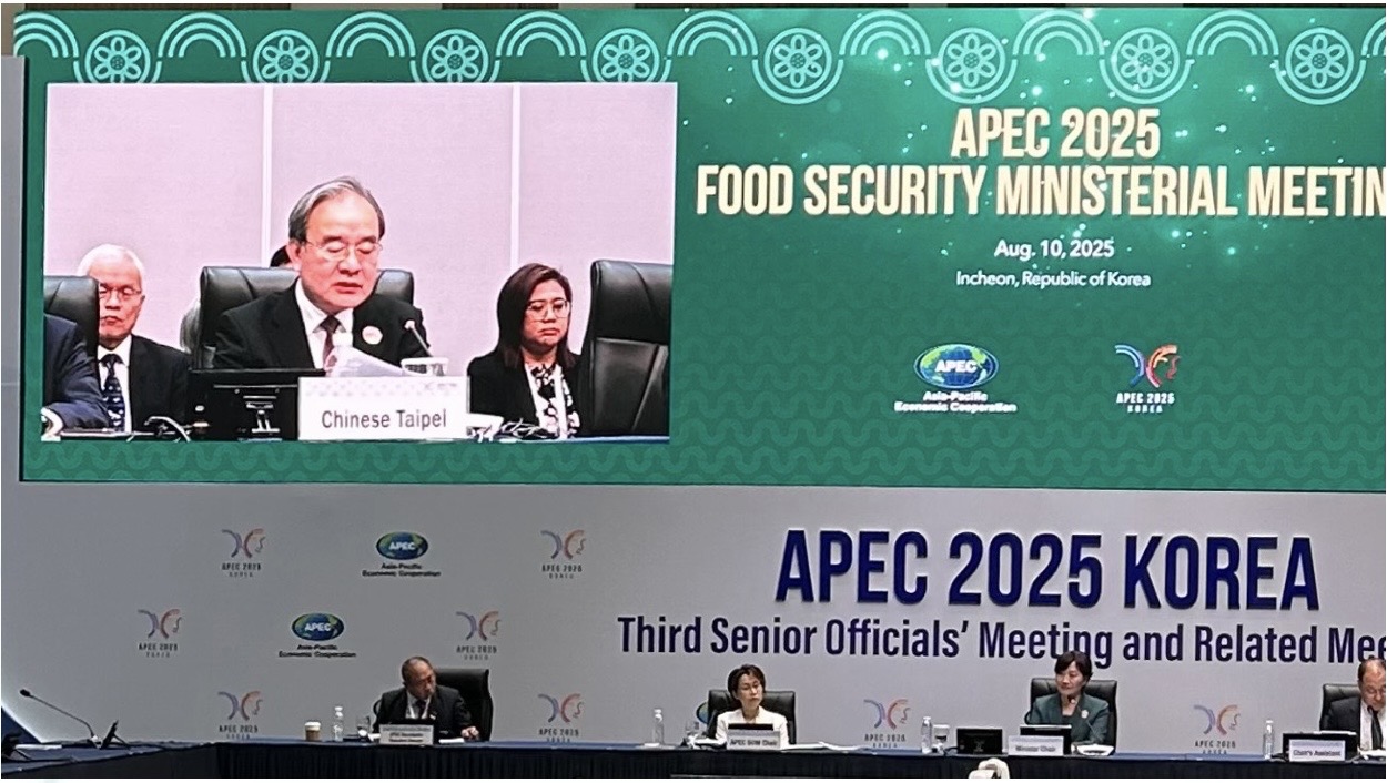 亞太經濟合作(APEC)第10屆「糧食安全部長會議」於本(114)年8月10日在韓國仁川舉行,我國由農業部次長胡忠一率團出席,會中與APEC各會員部長代表分享我國如何應用AI智慧,強化農業產業韌性與發展,因應氣候變遷、勞動力短缺與農糧供應鏈中斷等多重挑戰,獲得會員讚賞與肯定,並盼與我就相關議題擴大交流。