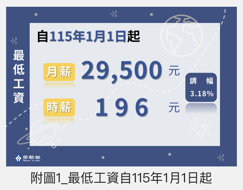 最低工資連十漲!審議會決定自115年1月1日起,每月最低工資調升至29,500元,每小時最低工資調升至196元。