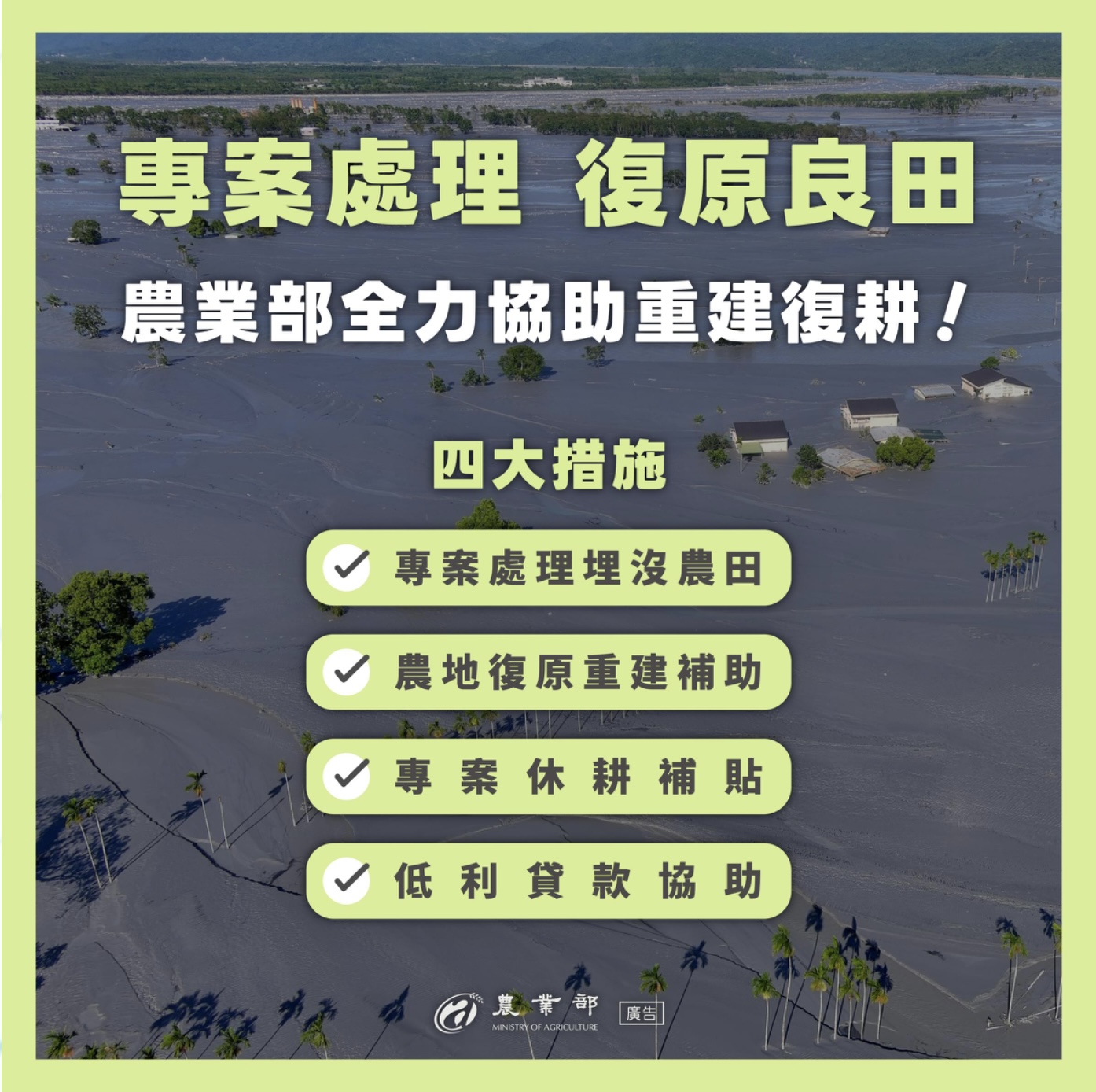 農業部表示,政府將作為農民最堅實的後盾,盡全力投入救災重建復原工作,也將讓政府的協助資源及時到位,共同攜手,讓受損的農地早日恢復蓬勃生機。