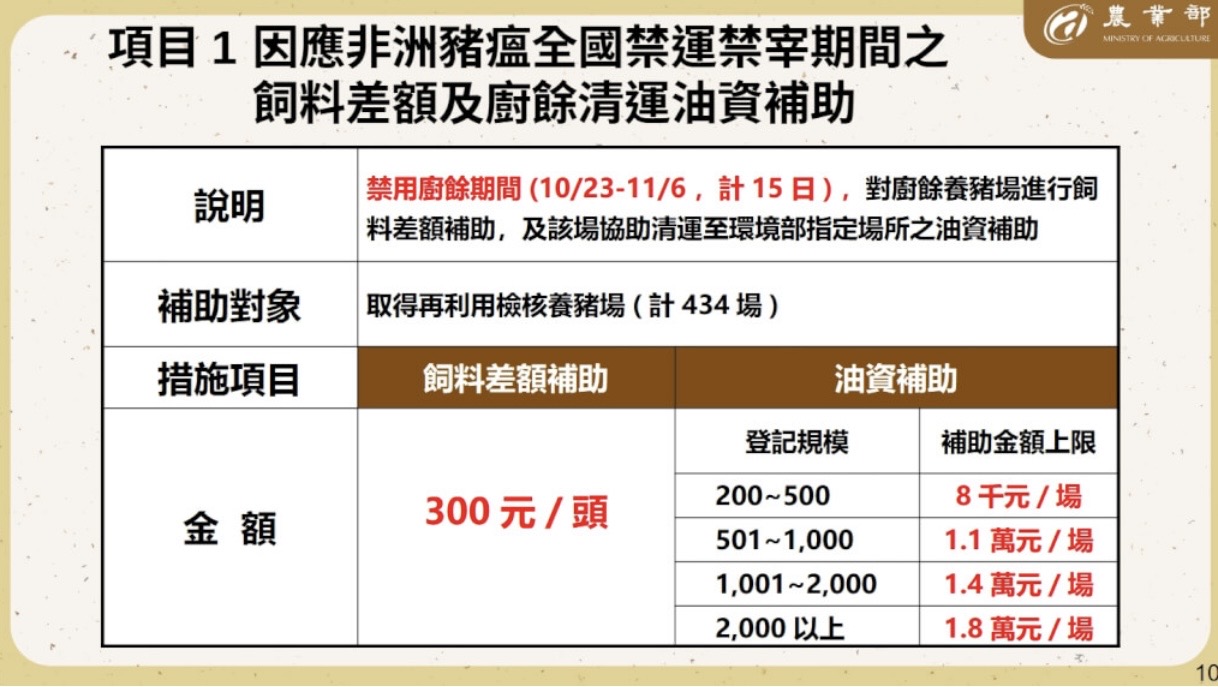 全台禁宰、禁運豬隻15天衝擊產業,行政院會今天通過養豬產業鏈的補助計畫,共投入新台幣11億元,補助養豬農民每頭豬隻810元的延遲上市飼料費、傳統肉攤暫停營業的收入損失每攤3萬元等,預計11月3日開放申請。