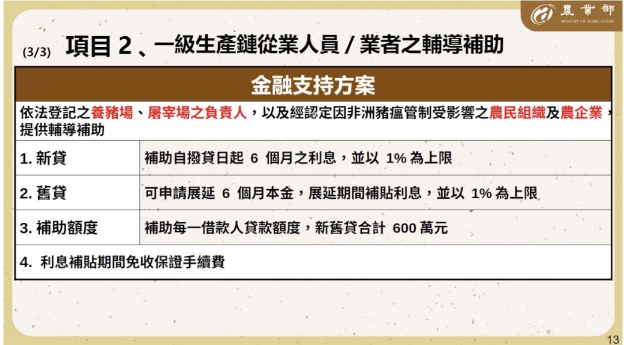 此次方案也有金融支持,只要依法登記的養豬場、屠宰場負責人,以及經認定因非洲豬瘟管制受影響的農民組織及農企業,都能申請金融支持方案。新貸者補助自撥貸日起6個月的利息,並以1%為上限,舊貸者可申請展延6個月本金,展延期間補貼利息,並以1%為上限。補助額度補助每一借款人貸款額度,新舊貸合計600萬元,且利息補貼期間免收保證手續費。