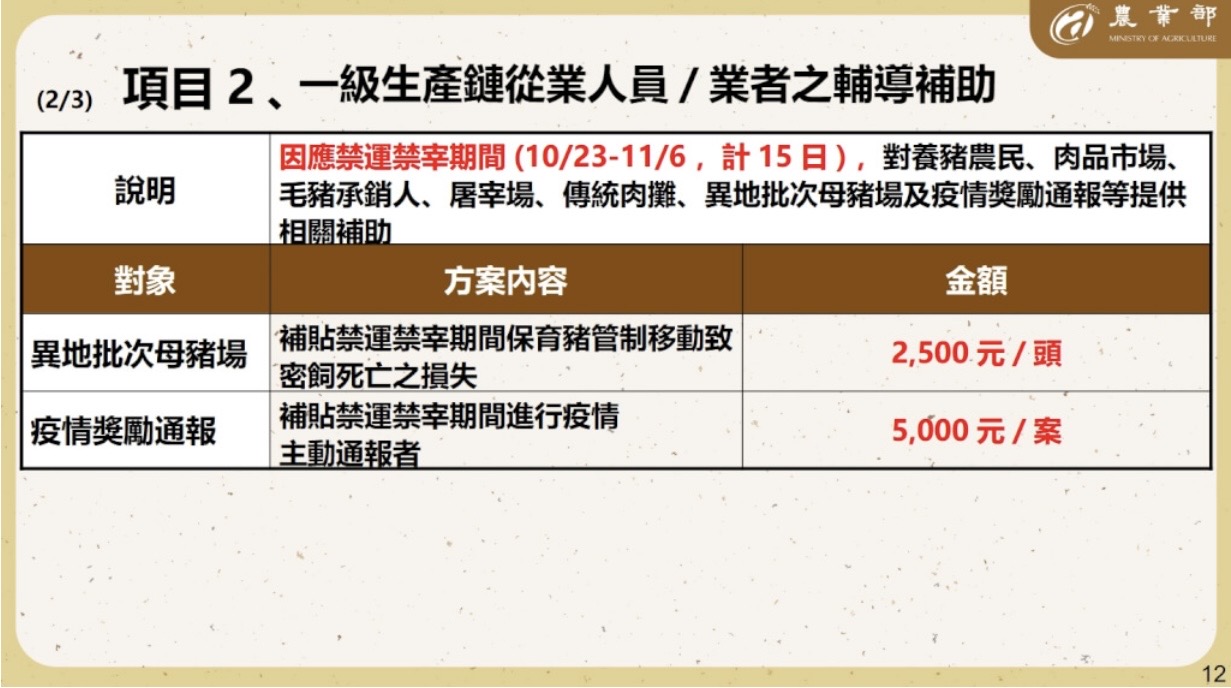 另外也補助禁運禁宰期間毛豬承銷人(自然人)暫停業務的收入損失,每人1.5萬元;補貼屠宰場停宰期間的人事及勞務費用損失,每頭280元。針對異地批次母豬場,也補貼禁運禁宰期間保育豬管制移動致密飼死亡的損失,每頭2500元。