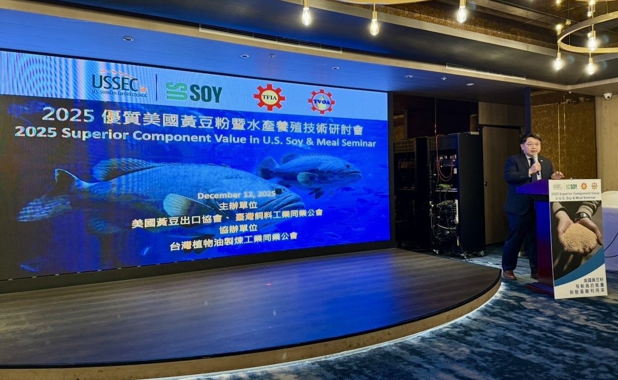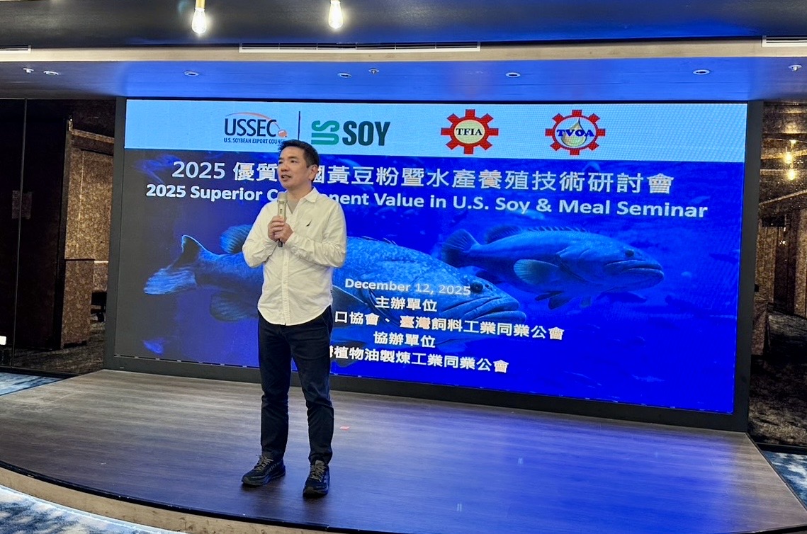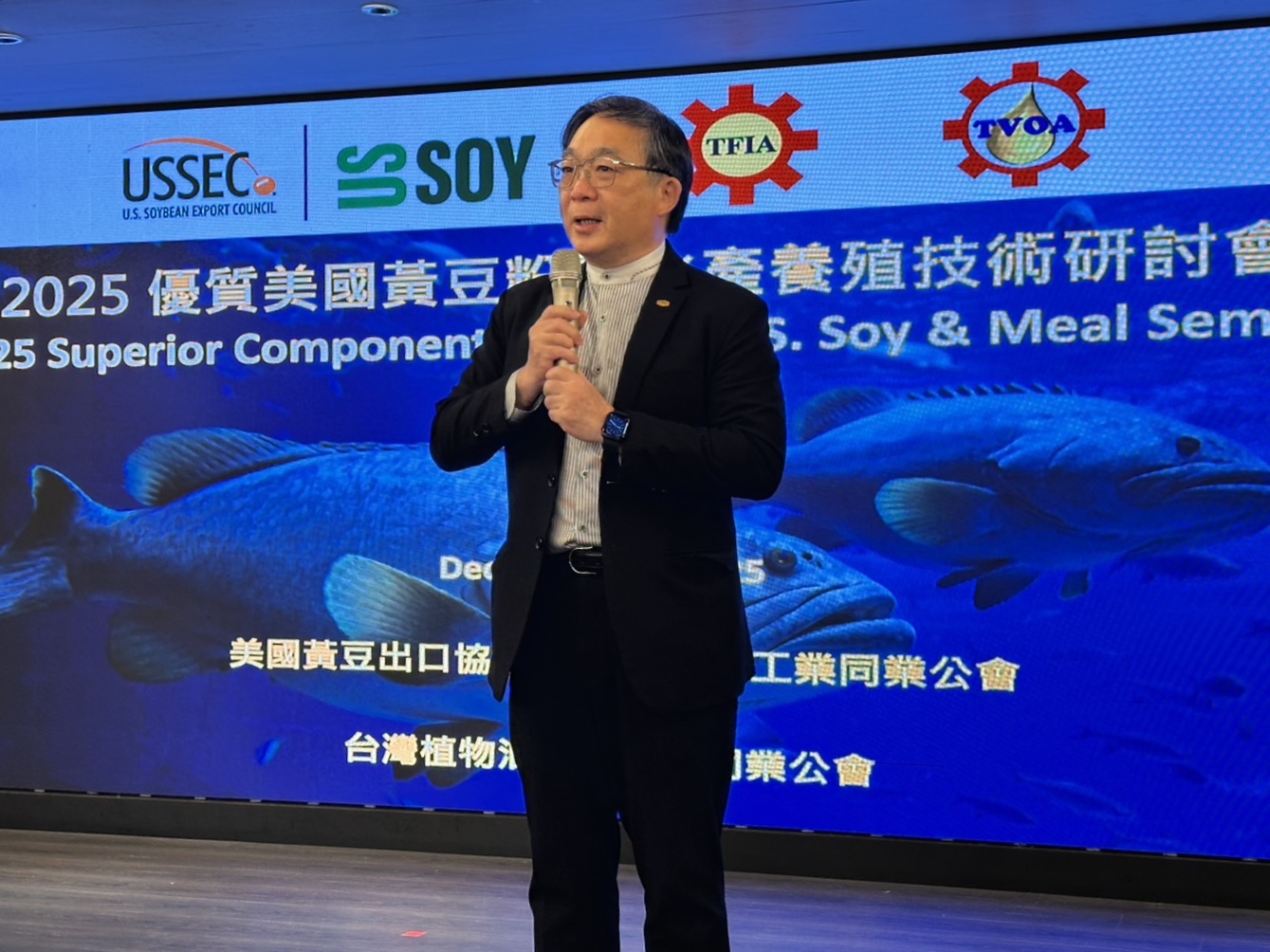 臺灣飼料工業同業公會 韓家寅理事長開幕致詞指出,面對全球人口成長、氣候變遷及資源永續等多重挑戰,水產養殖已成為確保蛋白質供應與糧食安全的重要產業。而飼料原料的穩定性、營養價值與永續來源,更是影響養殖效益與產業競爭力的關鍵因素。美國黃豆粉以其高品質蛋白、胺基酸組成均衡、來源穩定及可追溯性高等優勢,長期成為全球水產飼料不可或缺的重要原料,對提升養殖效率與產品品質,具有舉足輕重的地位。