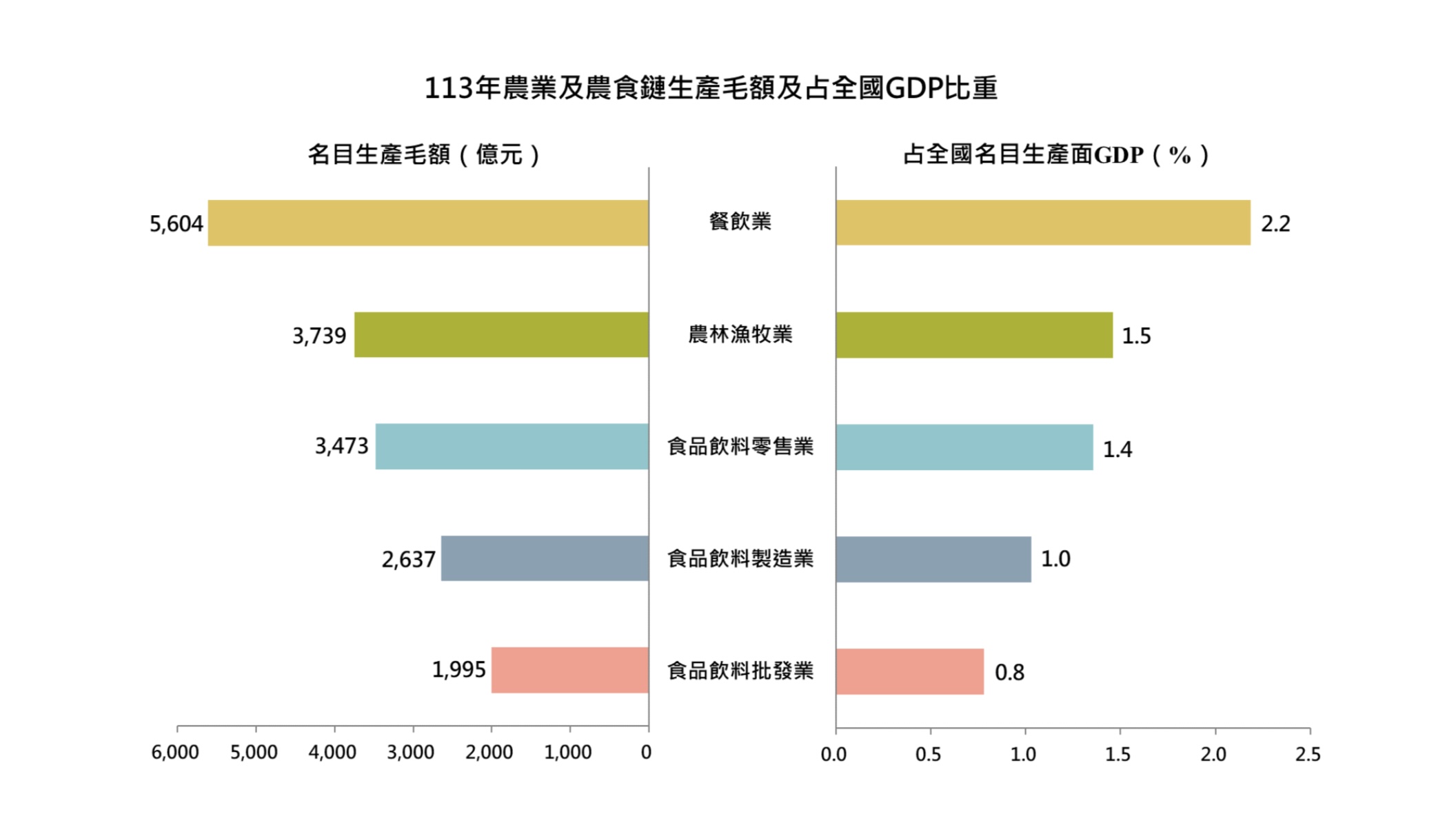 農業部表示,我國農業及農食鏈統計範圍包含初級農林漁牧業、食品飲料製造業、食品飲料批發業、食品飲料零售業及餐飲業。113年農業及農食鏈生產毛額(GDP)合計1兆7,449億元,創歷年新高,占全國生產面GDP 6.8%;依行業別觀察,餐飲業的占比最大,占GDP 2.2%,其次依序為初級農林漁牧業占1.5%、食品飲料零售業占1.4%、食品飲料製造業占1.0%,以及食品飲料批發業占0.8%。