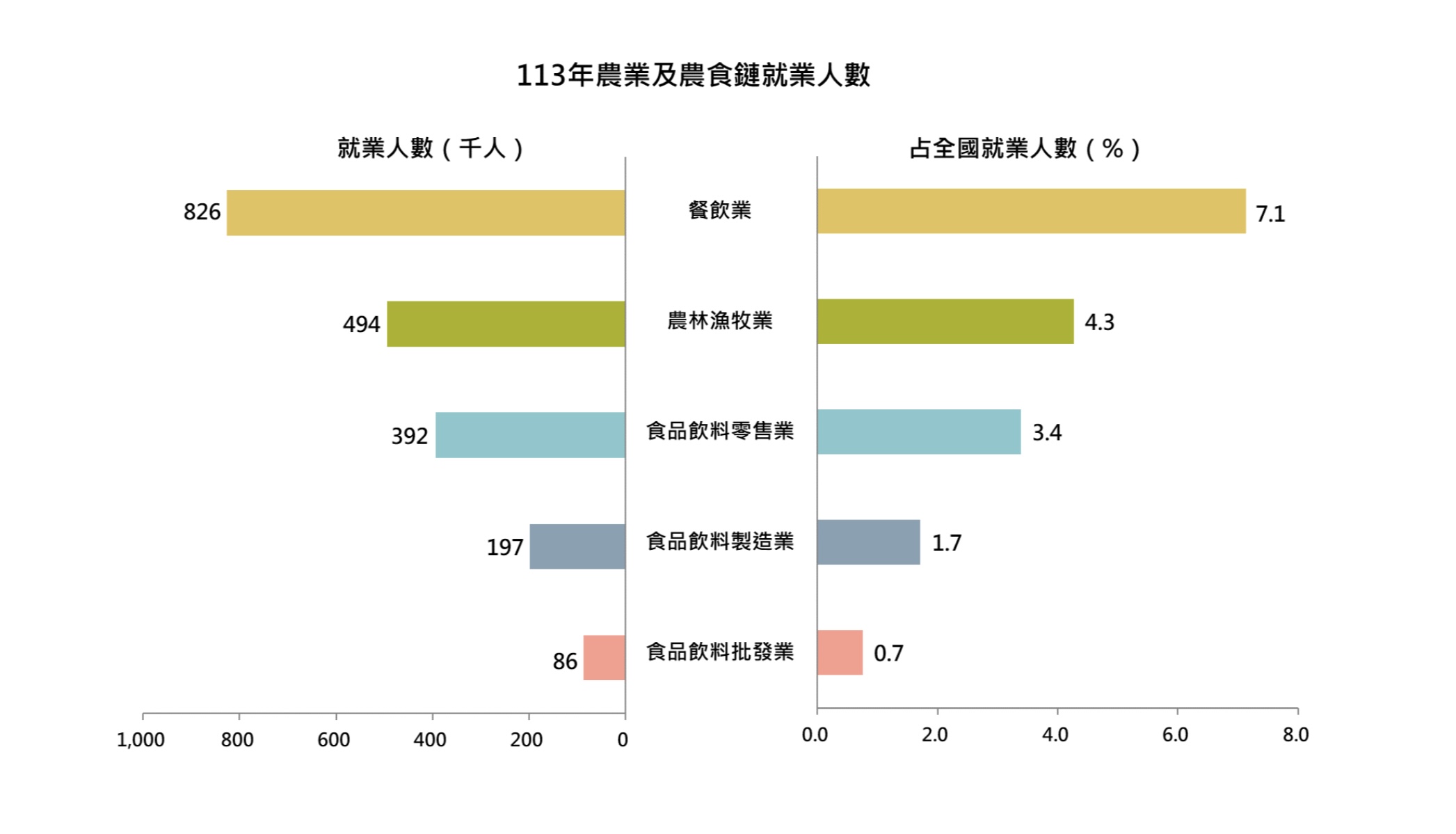 113年我國農業及農食鏈就業人數約200萬人,為3年來高點,占全國就業人數17.2%,平均每6人即有1人從事農業及農食鏈相關工作。按就業別結構觀察,以餐飲業就業人數83萬人占比最大(占全國就業人數7.1%),其次依序為初級農林漁牧業49萬人(4.3%)、食品飲料零售業39萬人(3.4%)、食品飲料製造業20萬人(1.7%)及食品飲料批發業9萬人(0.7%)。