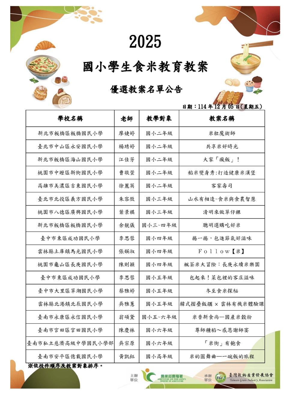 為推動食米教育並促進國產稻米及米穀粉於校園中的應用,臺灣榖物產業發展協會特辦理「國小學生食米教育教案徵件活動」,期望提升國小教師在食米教育課程開發與設計上的能力。此活動透過全國徵件方式,鼓勵各年級教師瞭解並掌握食米教育內涵,進而發展結合在地食米文化、傳承教育及環境永續等面向之課程與教材,帶領學生以素養導向方式進行實作與探究,增進對國產稻米與米穀粉的認識與支持,並連結食農產業發展。