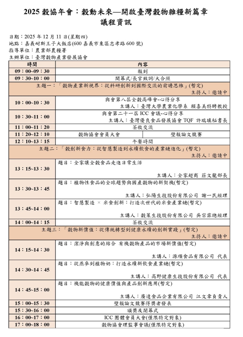 臺灣榖物產業發展協會訂於2025年12月11日(星期四)上午九點開始,辦理「2025穀協年會:穀動未來—開啟臺灣穀物雜糧新篇章」研討會,謹訂於中華民國114年12月11日(星期四),地點假嘉義耐斯王子大飯店( 600嘉義市東區忠孝路600號)舉行,邀請賴喜美教授等產官學各界主講及論文競賽得獎者發表,並進行心得分享與交流,內容精采可期。