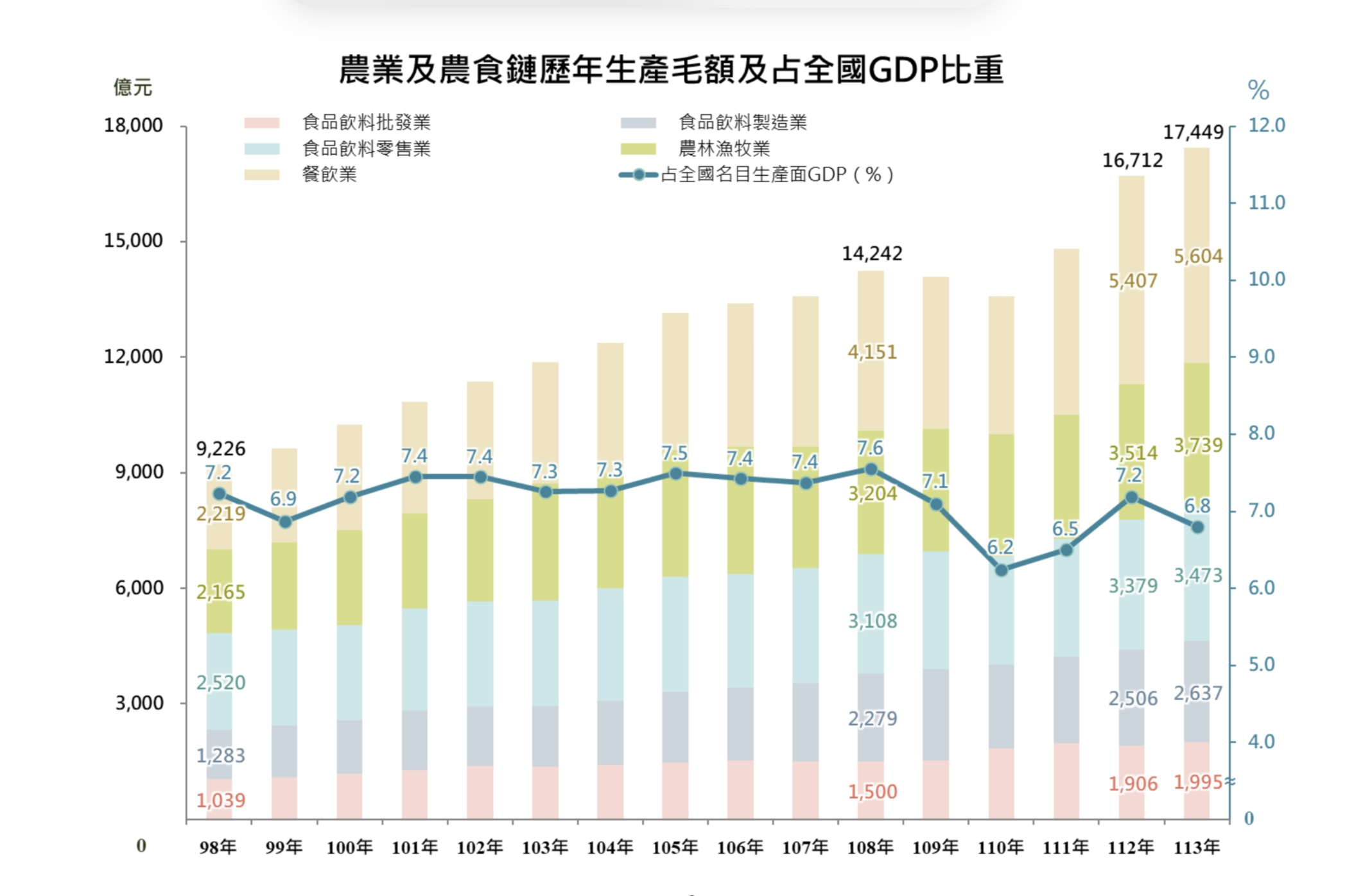 農業部表示,我國農業及農食鏈統計範圍包含初級農林漁牧業、食品飲料製造業、食品飲料批發業、食品飲料零售業及餐飲業。113年農業及農食鏈生產毛額(GDP)合計1兆7,449億元,創歷年新高,占全國生產面GDP 6.8%;依行業別觀察,餐飲業的占比最大,占GDP 2.2%,其次依序為初級農林漁牧業占1.5%、食品飲料零售業占1.4%、食品飲料製造業占1.0%,以及食品飲料批發業占0.8%。