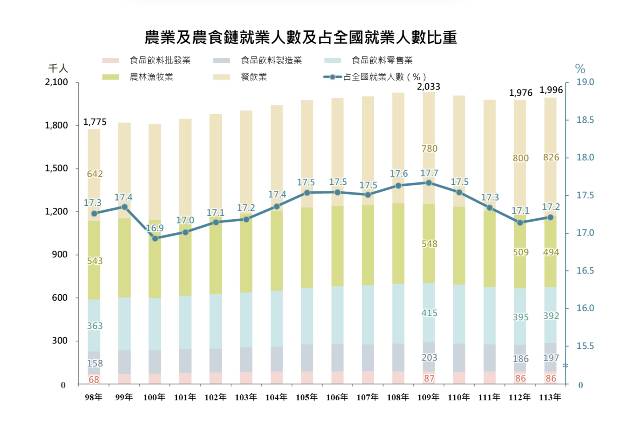 113年我國農業及農食鏈就業人數約200萬人,為3年來高點,占全國就業人數17.2%,平均每6人即有1人從事農業及農食鏈相關工作。按就業別結構觀察,以餐飲業就業人數83萬人占比最大(占全國就業人數7.1%),其次依序為初級農林漁牧業49萬人(4.3%)、食品飲料零售業39萬人(3.4%)、食品飲料製造業20萬人(1.7%)及食品飲料批發業9萬人(0.7%)。